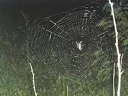Larinia jeskovi is a species of the family of orb weaver spiders and a part of the genus Larinia. It is distributed throughout the Americas, Africa, Australia, Europe, and Asia and commonly found in wet climes such as marshes, bogs, and rainforests.[2] Larinia jeskovi have yellow bodies with stripes and range from 5.13 to 8.70 millimeters in body length.[2] They build their webs on plants with a small height above small bodies of waters or wetlands. After sunset and before sunrise are the typical times they hunt and build their web. Males usually occupy a female's web instead of making their own.[3] The mating behavior is noteworthy as male spiders often mutilate external female genitalia to reduce sperm competition while female spiders resort to sexual cannibalism to counter such mechanisms. The males also follow an elaborate courtship ritual to attract the female.[4] The bite of Larinia jeskovi is not known to be of harm to humans.