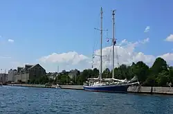 Larsens Plads (Larsen's Place) is a waterfront in Copenhagen, Denmark, which runs along the Zealand side of the Inner Harbour from the Nyhavn canal in the south to the Nordre Toldbod area just south of Langelinie to the north. The name refers to a shipyard which used to occupy the grounds but is now more associated with emigration to America after it became a major hub for trans-Atlantic traffic later in the century. Today, the area is dominated by Amalienborg Palace with the Amalie Garden and a number of late 18th-century warehouses which have been converted to other uses. The buildings facing the waterfront have their address on the parallel street Toldbodgade.