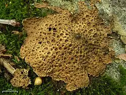 Sexual reproduction takes place in disc-shaped fruiting bodies (apothecia) that sit directly on the thallus or rise on short stalks near its margins. These discs are black and flat, rimmed by a persistent fungal exciple rather than thallus tissue. Each ascus typically produces a single large ascospore (occasionally two); the spores are muriform—divided by many internal walls—and gradually darken from pale to deep brown as they mature. Additional asexual spores are formed in tiny, flask-shaped cavities (pycnidia) embedded in the thallus; these release rod-shaped conidia that can start new colonies if they encounter a suitable algal partner. The genus is chemically characterised by the presence of gyrophoric acid, papulosin, and yellow-orange anthraquinone pigments.[6]