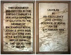 The Lascar War Memorial was erected by shipping and mercantile companies, in the memory of the 896 Lascars of undivided Bengal and Assam who lost their lives during World War I.[5] The monument is situated at the southern end of the Maidan, on Naiper Road, Hastings, near Prinsep Ghat. The 100 feet high monument was unveiled by Lord Lytton, then Governor of Bengal on 6 February 1924. The monument, built in typical Oriental style, is a four-sided column, having designs reflecting the prow of an ancient galley on each side of the column. The upper part of the monument consists of four small minarets and a large gilt dome. A typical Indian look has been given by adding wavy lines beneath the projected balcony, which symbolises waves, along with chhajjas and trellises.[3] The Lascar War Memorial has similarities with the victory tower of Chittor.[1] The memorial built in the Indo-Mughal style by William Ingram Keir, who also designed the Kidderpore Bridge, buildings at Bengal Engineering and Science University in Shibpur, the Indian Institute of Technology, Kharagpur, and Islamia College, and also replaced the 1934 earthquake affected spire of St. Paul's Cathedral, Kolkata with a tower. William Ingram Keir won a prize of Rupees 500 for designing the memorial.[2] The inside of the Memorial is approached through a huge doorway on the Northern wall. The interior contains three plaques below the inscription "Lascar Memorial." One plaque commemorates the unveiling of the memorial by Lytton. The second plaques says that the memorial was erected by shipping and mercantile community of India in memory of the 896 seamen of Bengal Assam and upper India (the term Lascar is not used) who lost their lives in service of the British Empire in the great war of 1914 – 18. The third smaller plaques tells about the renovation and lighting of the Lascar War Memorial.