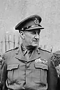 For the next two years, the 44th Division, after moving briefly to Gloucestershire and then Yorkshire, served as part of XII Corps, defending Kent against a potential German invasion of the United Kingdom. The 44th Division was commanded successively by Major Generals Arthur Percival, Noel Mason-MacFarlane and Brian Horrocks. It was both Horrocks, who commanded the division between June 1941 and March 1942, and the General Officer Commanding (GOC) of XII Corps, Lieutenant-General Bernard Montgomery, both of whom were to play a significant part in Whistler's subsequent career, who recognised his leadership potential.[24] Montgomery wrote that he, "first met Bolo Whistler in 1941... When I inspected his battalion and quickly realised that he was well above the ordinary run of battalion commanders and I decided not to lose sight of him." He also stated that during the fighting in North Africa, he, "realised what a fine soldier he was; I decided to take him with me wherever I might go during the war, and after. This I did, and never once did I have cause to regret my choice."[25] After the war Montgomery was to record that he had thought Whistler was the best infantry brigade commander in the British Army and that he had done well at divisional level as well.[4]