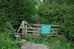 The wood was part of the 623 acres (252 ha) estate of the Guise family.[1] The land had been granted to their ancestor Anselm de Gyse by John of Burgh, a son of Hubert de Burgh, 1st Earl of Kent, in 1274.[2] The River Leadon formerly split into two channels, one of which ran by the eastern boundary of the woodland, this channel was diverted in 1867 and has since silted up.[3] Sir Anselm Guise sold the estate in 1921 but retained ownership of the wood, which he then donated to Gloucester County Borough Council.[1] This was as a mark of the Guise family's long association with the city.[2]