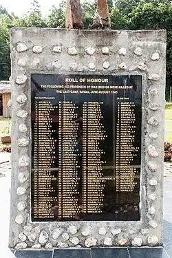 The stele is also made of concrete. Another 183 river stones are set into the concrete of the stele; one for each prisoner of war who died in this camp on Liwagu River. On the memorial stone there are four furrowed stone slabs. These stand for the four prisoners of war, who managed to escape during the death march. On each of the four sides of the stele is a stone slab of embedded polished granite. Three panels concerning the history of the death marches are shown in English, Chinese and Malay. On the fourth granite slab, the names of 183 prisoners of war are memorialised.[1]