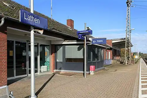 Lathen is a railway station[1] located in Lathen, Lower Saxony, Germany. The station lies on the Emsland Railway (Rheine - Norddeich) and the train services are operated by WestfalenBahn. Lathen is also the location of the Transrapid Maglev train track.
