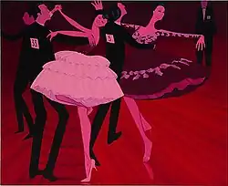 The painting shows the "lissom dancers in their richly decorated dresses and high-heeled shoes".[2] It also includes a self-portrait of the artist in the top-left corner, "more vulnerable than the rest, dancing alone without a partner."[1]