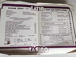 The menu reflected the Pop culture choices of the 1960s. The artwork for the menu cover was an ink drawing of the exterior façade on a background of drink glasses, music notes, and star like asterisks. In the inside cover the management stated "The Latin Casino offers the ultimate in facilities for Banquets, Conventions, Trade Shows, Fund Raising Events of every type. Group size may be from 20 to 2000."