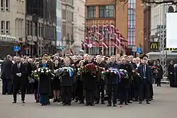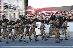 The annual military parade along the 11. novembra krastmala (November 11th Embankment) in Riga marked one of the main events of the centennial anniversary. It was the largest military parade in Latvian history with around 1,700 soldiers from the Latvian National Armed Forces participating in the march past.[7] It was composed of personnel of the Land Forces, Navy, Air Force, National Guard, Border Guard, Military Police, State Police, State Fire and Rescue Service and military academies. The parade was led by Latvian President Raimonds Vējonis, Chief of the National Defence Forces Leonīds Kalniņš and Naval Forces commander Ingus Vizulis.[8] Estonian President Kersti Kaljulaid and Armed Forces chief Riho Terras, Lithuanian President Dalia Grybauskaitė, Finnish President Sauli Niinistö and Icelandic President Guðni Th. Jóhannesson joined in attending the military parade and the celebrations. The NATO countries and other military partners of Latvia that were represented at the parade were Italy, Estonia, Lithuania, Poland, Romania, the Czech Republic, Finland, Albania, Croatia, the Netherlands, Norway, Slovakia, Spain Slovenia, Britain, Denmark, Sweden, Germany, Canada and the United States.[9]