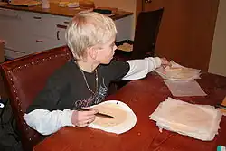 Laufabrauð can be bought in bakeries or made at home, either with ready-made dough or from scratch;[2] patterns are either cut by hand or created using a heavy brass roller, the laufabrauðsjárn ([ˈlœyːvaˌprœyðsˌjau(r)tn̥], "leaf bread iron").[3] The most common pattern consists of rows of "V"-like flaps; each flap overlaps with the next one to form a braid-like design. The rows can then form a larger pattern, such as a snowflake or a letter.