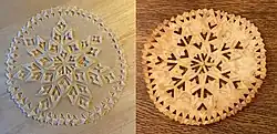 Laufabrauð (Icelandic pronunciation: [ˈlœyːvaˌprœyːθ], "leaf bread"; sometimes also called "snowflake bread" in English)[1] is a traditional kind of Icelandic bread that is almost exclusively eaten in the Christmas season.[2] Originating from northern Iceland but now eaten throughout the country,[2] it consists of round, very thin flat cakes with a diameter of about 15 to 20 cm (6 to 8 inches), decorated with leaf-like, geometric patterns and fried briefly in hot tallow or oil.[3]