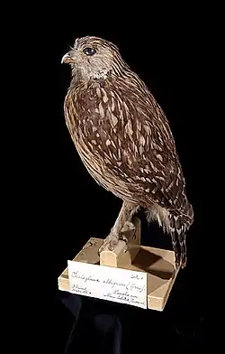 The laughing owl (Ninox albifacies), also known as whēkau, the laughing jackass,[4] or the white-faced owl, is an extinct species of owl that was endemic to New Zealand. Plentiful when European settlers arrived in New Zealand, its scientific description was published in 1845, but it was largely or completely extinct by 1914. The species was traditionally considered to belong to the monotypic genus Sceloglaux Kaup, 1848 ("scoundrel owl", probably because of the mischievous-sounding calls), although recent genetic studies indicate that it belongs with the boobook owls in the genus Ninox.