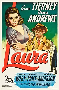 Laura is a 1944 American film noir produced and directed by Otto Preminger. It stars Gene Tierney and Dana Andrews, along with Clifton Webb, Vincent Price, and Judith Anderson. The screenplay by Jay Dratler, Samuel Hoffenstein, and Betty Reinhardt is based on the 1943 novel Laura by Vera Caspary. Laura received five nominations for the Academy Awards, including for Best Director, winning for Best Black and White Cinematography. In 1999, Laura was selected for preservation in the United States National Film Registry by the Library of Congress as being "culturally, historically, or aesthetically significant".[4][5] The American Film Institute named it one of the 10 best mystery films of all time, and it also appears on Roger Ebert's "Great Movies" series.[6]
