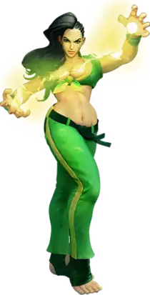 Many potential iterations were considered from various backgrounds, including a male soccer player that had grown up in a poor neighborhood who fought using a ball and soccer-themed kicks.[6] The design was scrapped, however, due to Nakayama feeling it was too similar to the character Roberto from another Capcom series, Rival Schools.[7] Meanwhile another early concept called "Wild Rapunzel" would have had long, fluffy blonde hair that she would have used to not only attack but shield herself from opponent's attacks. Other designs also followed, such as a very tall woman with dreadlocks and a long reach, and a female physical therapist that would have used moves that looked "extremely painful".[4]