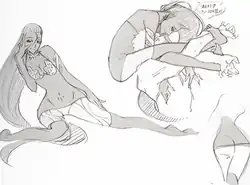 Several designs were more overtly sexual. One would have had her body wrapped in bandages, using them to attack with varying degrees of her body becoming exposed depending on the strength of the attack used. Meanwhile, a design dubbed "Clumsy Cutie" would have featured a girl in patchwork shirt and pants. As she fought, her clothes would become tattered and tear off her body, gradually revealing more of it. While this design was unused, Nakayama considered utilizing it for a stand-alone character at a later time.[7] Other outfits had varying degrees of exposure, such as utilizing a black belt for a makeshift bra, and emphasis was placed on her physical curves, primarily to have her buttocks exposed.[6] Nakyama explained that in his view, "a characteristic of Brazilian women is that their buttocks tend to get bigger when they exercise", and wanted to leave them exposed for ease of movement.[1] Additional consideration was given to her hairstyle, considering options that would give her a "sexy" or "naughty" appearance.[6]