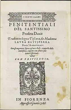 Laura Battiferri (1523–1589), also called Laura Battiferri Ammannati, was an Italian poet during the Renaissance period. She was born in Urbino, Marche, Italy as the illegitimate daughter of Giovanni Antonio Battiferri from Urbino and Maddalena Coccapani from Carpi, Emilia-Romagna. She published two books of poetry: The First Book of Tuscan Works (Florence, 1560) and The Seven Penitential Psalms… with some Spiritual Sonnets (Florence, 1564). She died in 1589 while compiling a third, Rime, which was never published. She married the sculptor, Bartolomeo Ammannati in 1550 and they remained married until her death. The couple had no children.