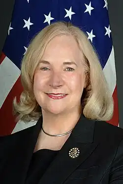 After retirement in 2013, she was recalled to service in 2014 to serve as Chargé d'Affaires at the U.S. Embassy in Turkmenistan and then the U.S. Mission to International Organizations in Vienna (UNVIE), leaving government again in 2015. She is active lecturing and commenting on foreign affairs, arms control and U.S. politics.[4] She serves on the boards of Foreign Policy for America and the Arms Control Association.[5][6] She is a member of the Szilard Advisory Board of the Center for Arms Control and Nonproliferation, the Deep Cuts Commission, the American Academy of Diplomacy, and the Leadership Council for Women in National Security.[7][8][9][10]
