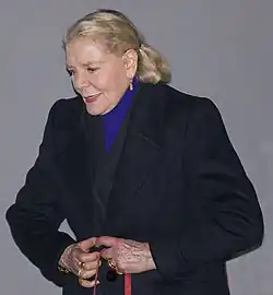 In September 2006, Bryn Mawr College awarded Bacall its Katharine Hepburn Medal, which recognizes "women whose lives, work, and contributions embody the intelligence, drive, and independence" of Hepburn.[75] She delivered an address at the memorial service of Arthur M. Schlesinger Jr. at the Reform Club in London in June 2007.[76] She finished her role in The Forger in 2009.[77] The Academy of Motion Picture Arts and Sciences bestowed an honorary Academy Award upon Bacall at the inaugural Governors Awards on November 14, 2009.[78] In July 2013, Bacall expressed interest in the film Trouble Is My Business.[79] In November, she joined the English-dubbed voice cast for StudioCanal's animated film Ernest & Celestine.[80] Her final role was in 2014 as a guest voice appearance in the Family Guy episode "Mom's the Word".[81]