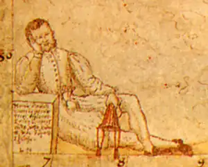 Nowell's self-portrait with an empty purse, from the lower left corner of the pocket map he prepared for William Cecil
