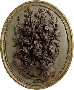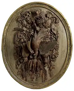 He created in his decorative works complicated trophies, deeply carved and superimposed, with motifs of foliage, flowers, birds and crustaceans sometimes accompanied by putti. His execution of the human figure did not match the perfection of the still-life elements in these works. Some of his wood works were so subtly carved that the foliage and branches on the edges moved and quivered at the slightest movement.[5]