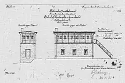 The station also had two Signal boxes, one of which still exists and is protected as a monument. It is built of ashlar with three portals on the long sides. Its floor is made of bricks and it has iron rooms.[32] In addition, it had a clamping room (Spannwerk) in the basement to ensure correct tensions on the interlocking cables.[33]