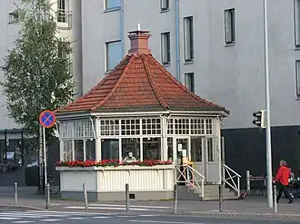A local voluntary fire brigade was founded in 1916 by the initiative of postman Emil Wathén[31] with financial support from Julius Tallberg, for which Tallberg donated the building lot and building supplies for its own fire brigade house.[10]: 193 This classic wooden fire brigade house with a hose tower was in service until 1965 when it was dismantled and was replaced with the current fire brigade house built from stone.