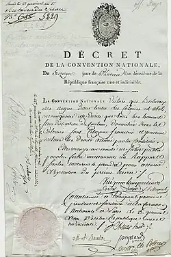 Sonthonax sent delegates back to Paris to advocate for emancipation.[11] While the delegates were briefly arrested by opponents of Sonthonax, they were well received by the National Convention, where they justified the earlier proclamation on both practical and moral grounds.[11] After their speeches, Jean-François Delacroix exclaimed that the National Convention should not "dishonor itself by a long discussion",[12] and so it passed the law by acclamation.[11]
