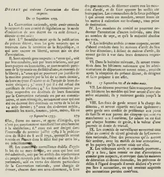 - ^ (in French) Decree of 17 September 1793 ordering the arrest of Suspect People. Gallica, the digitalized Bibliothèque nationale de France. Retrieved 21 April 2017.