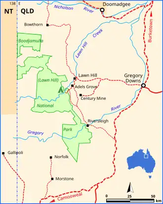 9. ^ a b c "Boodjamulla (Lawn Hill) National Park (entry 43617)". Queensland Place Names. Queensland Government. Retrieved 25 June 2017.
