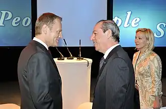 Lawrence Gonzi KUOM (born 1 July 1953) is a Maltese politician,[2] retired Nationalist politician and lawyer, who served for twenty-five years in various critical roles in Maltese politics.[3] Gonzi was Prime Minister of Malta from 2004 to 2013, and leader of the Nationalist Party. He also served as speaker of the House from 1988 to 1996, and Minister of Social Policy from 1998 to 2004, as well as deputy prime minister from 1999 to 2004.[4] He served in practically all positions in Parliament, being also Leader of the House, an MP and Leader of the Opposition.[5]