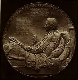 The Saint-Gaudens medallion depicting Robert Louis Stevenson; Built into the chimney of Low's studio at 25 Prescott Avenue