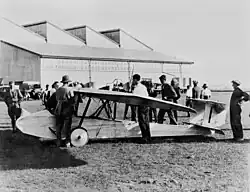 Wackett later transferred to No. 3 Squadron AFC in France and played a significant role in the Battle of Hamel fought on 4 July 1918. Captured German documents revealed that they had been experimenting with dropping ammunition from aircraft and No. 3 Squadron was asked to investigate doing the same. Wackett was asked to do the work as his reputation had spread; 'he had a gift for mechanical inventions' according to his superiors.[5] Now a captain, he devised a small parachute that could be used to drop supplies to troops, designed a modified bomb rack to hold the supplies and then trained No. 3 Squadron personnel in the required technique. General Monash's battle plan for Hamel involved resupplying the engaged machine-gunners with ammunition dropped by aircraft. In the event No. 3 Squadron was assigned other tasks during the battle and the ammunition dropping was performed by No. 9 Squadron RAF. Monash later wrote, "at least 100,000 rounds of ammunition were [dropped] during the battle with obvious economy in lives and wounds. The method thus initiated became general in later months".[3][8] Later that year, on 25 September, Wackett undertook a daring reconnaissance mission in 3 Squadron's first Bristol F.2 Fighter, when he penetrated six miles (10 km) behind enemy lines to take aerial photographs of the German Joncourt-Villers Outreaux line, that were needed for a forthcoming attack.[5] Two days later he carried out an ammunition resupply flight to some isolated troops using the equipment he had designed. As a result of these two actions he was awarded the Distinguished Flying Cross.[9] By the end of the war two months later he had been promoted to the rank of major. On 6 January 1919 he was appointed the Commanding Officer of No. 7 Squadron AFC based at Leighterton in England. 7 Sqn. had acted as the training unit for No. 3 Squadron during the recent conflict and Wackett remained the CO until the Squadron was disbanded in March that year, at which time he returned to Australia.