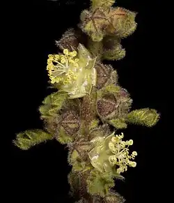L. densiflora is a perennial shrub/herb, growing to a height from 0.07 to 0.6 m.[1] The stems are hairy.[1] The leaves are irregularly lobed, 10 to 40 mm long and 5 to 20 mm wide, with stellate hairs.[1] The flowers have both a calyx and a corolla, and are yellow to cream and seen between July and October.[1]