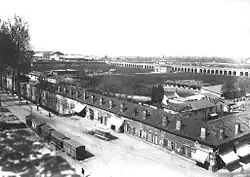 The Lazzaretto of Milan was a quadrangle with 400 yard long sides, designed by Lazzaro Palazzi in the late 15th century. It was located outside the city walls and Porta Orientale. In the center an altar had been placed in the open ground. After the Lazzaretto was used for housing the ill during the plague epidemic of 1576, the archbishop Carlo Borromeo commissioned a new church from Pellegrino Tibaldi. Construction from 1558 to 1592, erected this centralized church with open circumferential arches which allowed the ill to see services from all corners of the surrounding porticos.[1][2] After the French occupation of the Duchy, the lazzaretto was used as barracks. During the Cisalpine Republic, the architect Giuseppe Piermarini was commissioned to transform the church into a secular Temple of the Nation (Tempio della Patria). Piermarini Demolished the cupola, and walled the sides, but reconstruction soon ceased. During the 19th century, the central fields of the Lazzaretto were used for agriculture, and the surrounding cloister was used by peasants. In the late 19th century, the Lazaretto buildings were nearly entirely demolished, and the church was reconsecrated by 1884, with a new dome and an added facade portico.