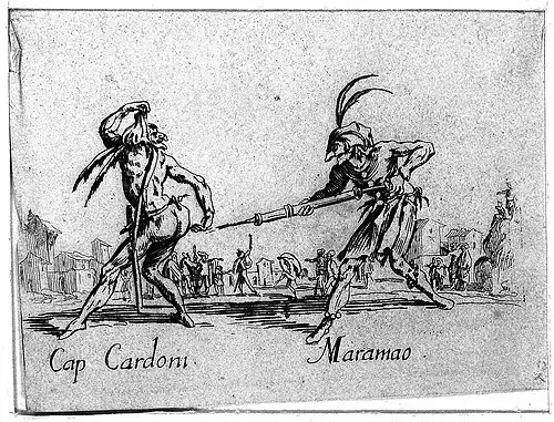 The lazzi were stage jests in mime or words, sometimes even in dances (sarabands, pavanes, galliards, bergamasques, chaconnes and the like) and songs (strambotti- short rounds in folk style, frottole- popular songs, arias, canzoni) accompanied by musical instruments such as the guitar, the theorbo, the flute, the Neapolitan lute and the mandola or small lute.