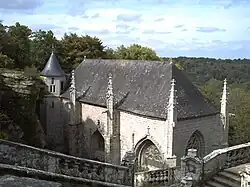 The chapel of Saint Barbara is sited on a hilltop overlooking the Ellé. The 15th-century chapel of Saint Fiacre was recently restored. The polychrome timber interior was highly regarded, and earned its creator, Olivier Le Loergan, a title of nobility. The stained glass is also noteworthy. Parts of the interior have suffered considerable damage from insects.