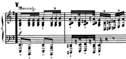This variation is marked forte, trombata ("trumpets"), with staccato sixteenth triplets and mordents, combined with frequent overlapping of the hands.