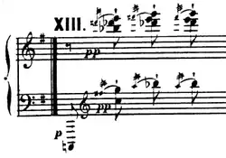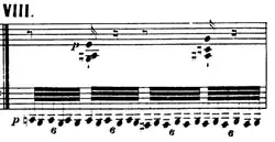 Concludes the first Maggiore variations as the undulating sextuplets move to the bass and the melody moves to the lower treble. The richness of the chords are supported by exotic modulations and references to late Romanticism and Impressionism. Meanwhile, the bass plays very wide broken chords (requiring a supple wrist to play) and arpeggios that end unexpectedly in the next variation.