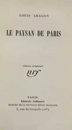 Le Paysan de Paris is a surrealist book about places in Paris. Written by Louis Aragon, it was first published in 1926 by Editions Gallimard. The book was first published in English in 1971 under the title Paris Peasant by Jonathan Cape, in a translation by Simon Watson Taylor, English member of the Surrealist movement.[1]