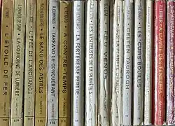 From number 81 onwards the number was in theory separated from the title on the back cover by a horizontal line, though many later works did not do so. Five works bear a double number, number 111 was never assigned and number 110 was assigned twice (the correct holder was La Machine suprême by John W. Campbell as it was the first of the two to be published). Despite all this, an 'official' list of already-published works appeared at the end of some of the works.