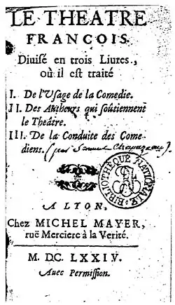 Its full title is Le Théâtre françois divisé en trois Livres, où il est traité I. De L’Usage de la Comédie. II. Des Auteurs qui soutiennent le Theatre. III. De la Conduite des Comédiens, Lyon, Michel Mayer, 1674