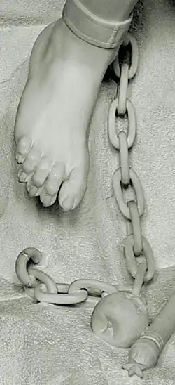 But the most apparent departure from L'ange du mal is the placing of Lucifer in bondage, with his right ankle and left wrist chained. In 19th-century reinterpretations of ancient Greek and Christian myths, Lucifer was often cast as a Promethean figure, drawing on a tradition that the fallen angel was chained in Hell just as the Titan had been chained and tortured on the rock by Zeus: "The same Prometheus who is taken as an analogue of the crucified Christ is regarded also as a type of Lucifer," wrote Harold Bloom in remarks on Mary Shelley's 19th-century classic Frankenstein, subtitled The Modern Prometheus.[32] In A.H. Krappe's folkloric typology, Lucifer conforms to a type that includes Prometheus and the Germanic Loki.[33]