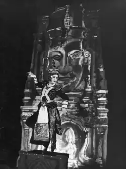 Nothing is known of Niako's life in service of Schellenberg.[8] Niako wished to return to her dancing career, but Goebbels opposed this, noting that it was a 'difficult topic' on account of the Sosnowski affair. In the end, Goebbels helped Niako by arranging a contract with the German Opera House but Niako was almost never allowed to perform.[23] On 8 March 1937, she held a dance performance at the Volksbühne on Horst-Wessel-Platz (today Rosa-Luxemburg-Platz) in Berlin.[24] In January 1938, Niako was arrested and sentenced to nine months in prison for treason[25] but was shortly thereafter pardoned.[26] On 2 February 1938 and 1 March 1939 she again performed at the Volksbühne.[27][28] Though she no longer performed in the nude, Niako continued to dance erotically and acrobatically, taking inspiration from folk dances to create a unique and atmospheric experience. Her costumes were, at least during this time, designed and made by Henny Kruse.[29]