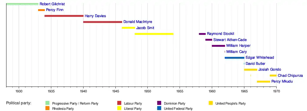 - ^ At the 1970 election, the electoral system changed. Although the African MPs formed themselves into parties, the Rhodesian Front government declined to recognise any of them as the formal Opposition and therefore did not have a leader of the opposition. There was a white opposition party, the Rhodesia Party formed by Rhodesian Front defector Allan Savory MP in 1972, but he was not recognised as leader of the opposition either. Neither was the Rhodesian Action Party recognised as the lead opposition party when formed in 1977 — instead the Rhodesian Front government dissolved Parliament and called an early election.