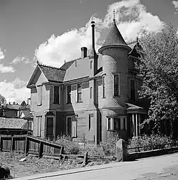 Leadville was founded in 1877 by mine owners Horace Tabor and August Meyer at the start of the Colorado Silver Boom. Tabor's house was also built in 1877, at 116 E. 5th Street.[18] The town was built on desolate flat land below the tree line. The first miners lived in a rough tented camp near the silver deposits in California Gulch.[19] Initially, the settlement was called "Slabtown", but when the residents petitioned for a post office, the name "Leadville" was chosen. By 1880, Tabor and Meyer's new town had gas lighting, water mains, 28 miles (45 km) of streets, five churches, three hospitals, six banks, and a school for 1,100 students. Many business buildings were constructed with bricks hauled in by wagons.[20]