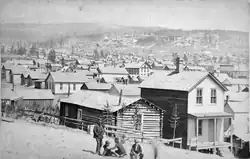 Mining in the Leadville area began in 1859 when prospectors discovered gold at the mouth of California Gulch. By 1872, placer mining in California Gulch yielded more than $2,500,000, roughly equivalent to $66,000,000 in 2024.[22] In 1876, black sand, once considered bothersome to placer gold miners, was discovered to contain lead carbonates, leading to a rush of miners to the area and the founding of the town in 1877. By 1880, Leadville was one of the world's largest and richest silver camps, with a population of more than 15,000. Income from more than thirty mines and ten large smelting works produced gold, silver, and lead amounting to $15,000,000 annually. The Leadville strike of 1880 was the first major labor conflict in the central Colorado silver boomtown, shutting down most of the area’s mining district from May 26, 1880.[13]