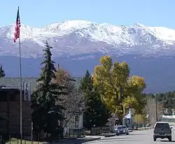 At an elevation of 10,158 feet (3,096 m), Leadville lies close to timberline, which in Colorado is from 11,000 to 12,000 feet (3,400 to 3,700 m).[42] The surrounding peaks are all well above 12,000 feet, and are thus bare of trees. Leadville has the highest elevation of any city in the United States.[43]