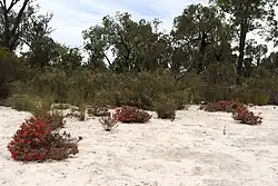 Scarlet leschenaultia usually grows in sandy soils in woodland between Meckering, Clackline and Kukerin in the Avon Wheatbelt, Jarrah Forest and Mallee biogeographic regions of south-western Western Australia.[2][3]