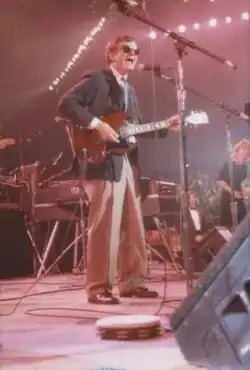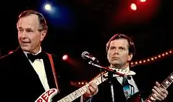 As a teenager in Columbia, South Carolina, Atwater played guitar in a rock band, The Upsetters Revue.[4] Even at the height of his political power, he would often play concerts in clubs and church basements, solo or with B.B. King, in the Washington, D.C., area. He released an album called Red Hot & Blue on Curb Records, featuring Carla Thomas, Isaac Hayes, Sam Moore, Chuck Jackson, and King.[5] In the Los Angeles Times of April 5, 1990, Robert Hilburn wrote about the album: "The most entertaining thing about this ensemble salute to spicy Memphis-style 1950s and 1960s R&B is the way it lets you surprise your friends. Play a selection such as 'Knock on Wood' or 'Bad Boy' for someone without identifying the singer, then watch their eyes bulge when you reveal that it's the controversial national chairman of the Republican Party, Lee Atwater."[6] During the 1960s, Atwater briefly played backup guitar for Percy Sledge.[5]