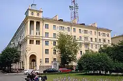 Though Oswald had wanted to attend Moscow State University, in January 1960 he was sent to Minsk, Byelorussia, to work as a lathe operator at the Gorizont Electronics Factory, which produced radios, televisions, and military and space electronics.[64] Stanislau Shushkevich, who later became independent Belarus's first head of state, also worked at Gorizont at the time, and was assigned to help Oswald improve his Russian.[65] Oswald received a government-subsidized, fully furnished studio apartment in a prestigious building and an additional supplement to his factory pay, which allowed him to have a comfortable standard of living by working-class Soviet standards,[66] though he was kept under constant surveillance.[67]