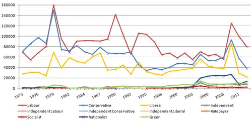 Summary of the council composition after council elections, click on the year for full details of each election. Boundary changes took place for the 1980 election which increased the number of seats by 3, leading to the whole council being elected in that year. Further boundary changes made in 2004 again required the full council to be elected.[22]