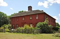 The Leffingwell Inn is located just south of the junction of Town and Washington Streets, at the southern end of the Norwichtown area. It is a 2+12-story wood-frame structure, built in stages in the 17th and 18th centuries. The northeastern corner dates to 1675 and was built by Stephen Backus. The Inn was founded by Thomas Leffingwell 2nd, the son of Norwich co-founder Thomas Leffingwell.[2] It was altered and expanded several times over the next century until it reached its present configuration. It is a roughly square structure with two main facades and long sloping roof lines along the other two facades, as if two saltbox houses had been joined at a corner. It has many features dating primarily to the 18th century, including casement windows, wooden paneling, and several kitchen hearths.[3]